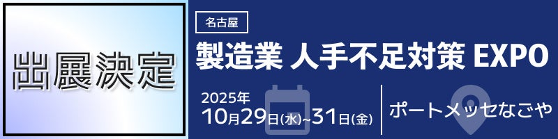 また、2025年10月29日(水)から31日(金)にポートメッセなごやで開催される「製造業 人手不足対策 EXPO」にも出展が決定していますので、ご興味がある方は以下のボタンより事前登録の上ご来場をお待ちしております。