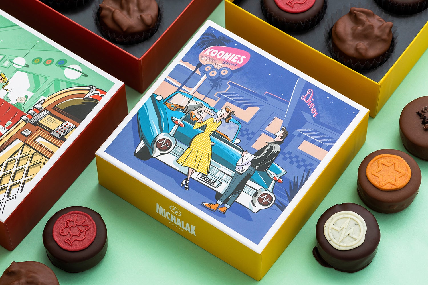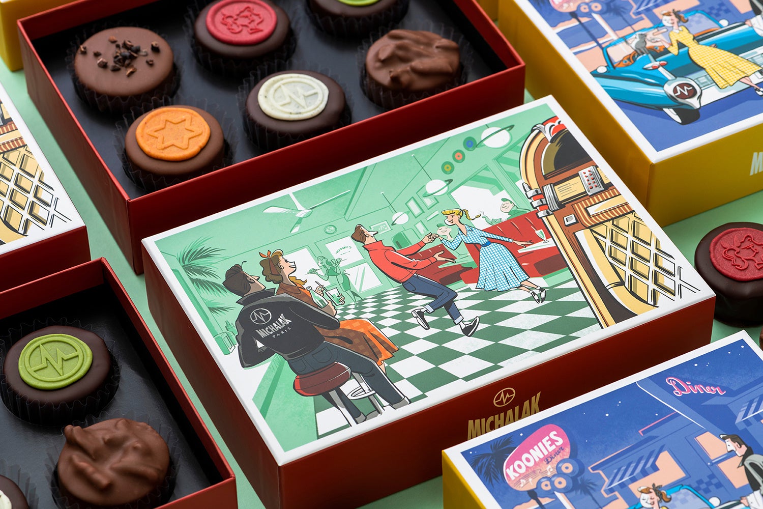 今年のテーマは「音楽を止めないで(N'ARRÊTEZ PAS LA MUSIQUE!)」舞台は1950年代のダイナー。軽快なビートが魅力のロカビリー、おしゃれでムーディーなジャズ…ジュークボックスからは流行歌が次々と聞こえてきます。曲に合わせて踊る仲間たちもいれば、ドライブを楽しむロマンチックなカップルも。どこか懐かしい雰囲気の中にも、ミシャラクらしいモチーフを盛り込み、このパッケージのためのオリジナルイラストに仕上げました。イラストは、国内外の雑誌、書籍、広告等で活躍するイラストレーター橋本聡氏による描き下ろしです。