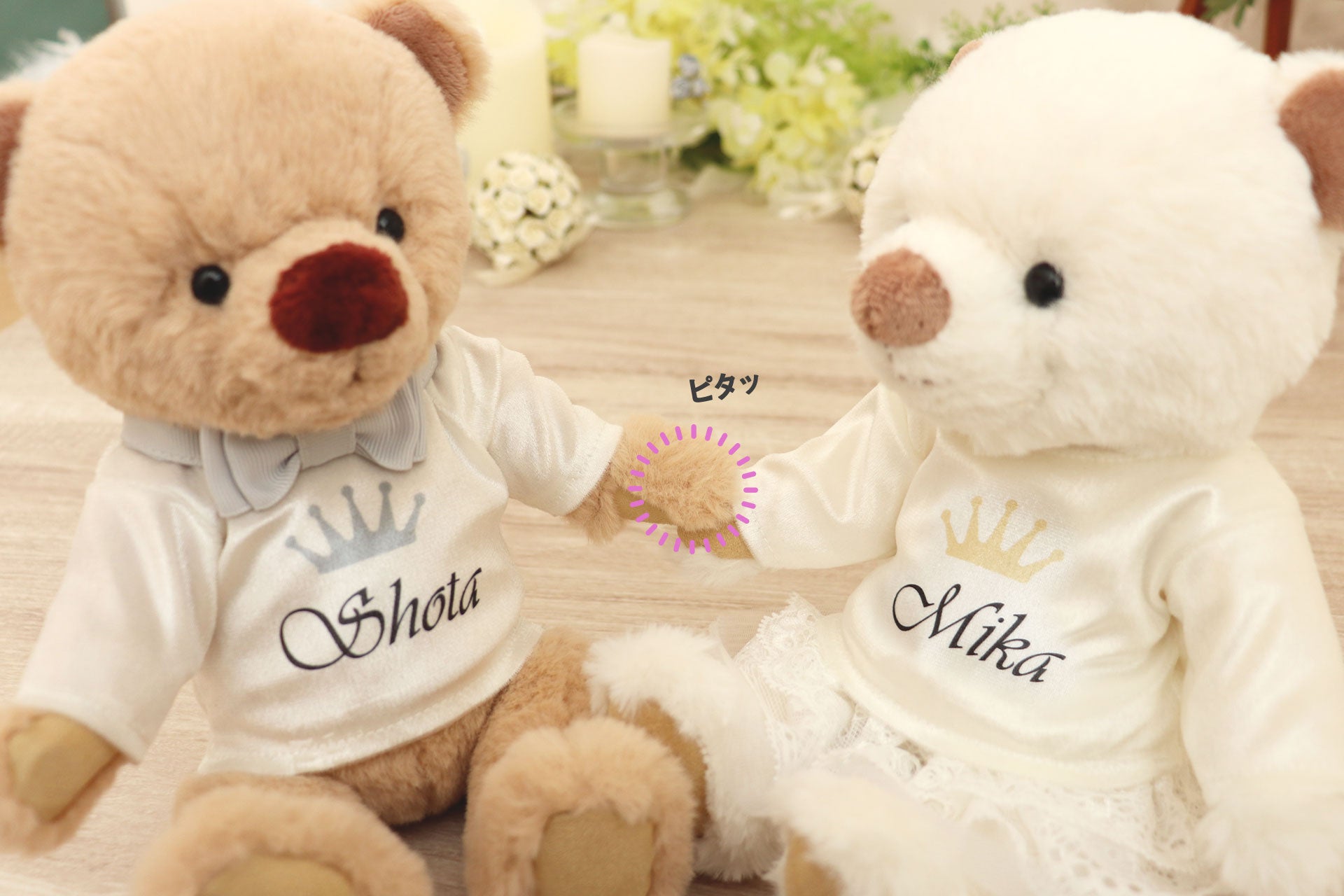 【新商品】手をつなぐポーズや照れてるポーズが楽しめる、一味違うウエディングベア。特別感たっぷりのドレス&タキシードと、今っぽいお名前入りTシャツ着用の2種を発売。着せ替えて式後もずっと飾れます