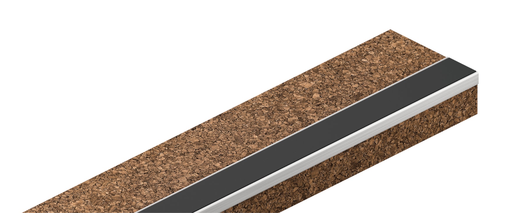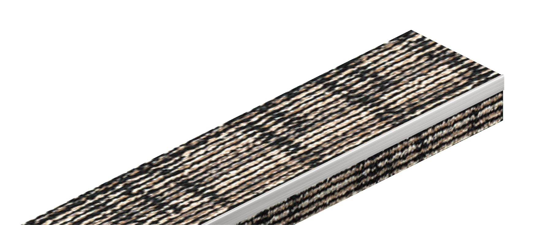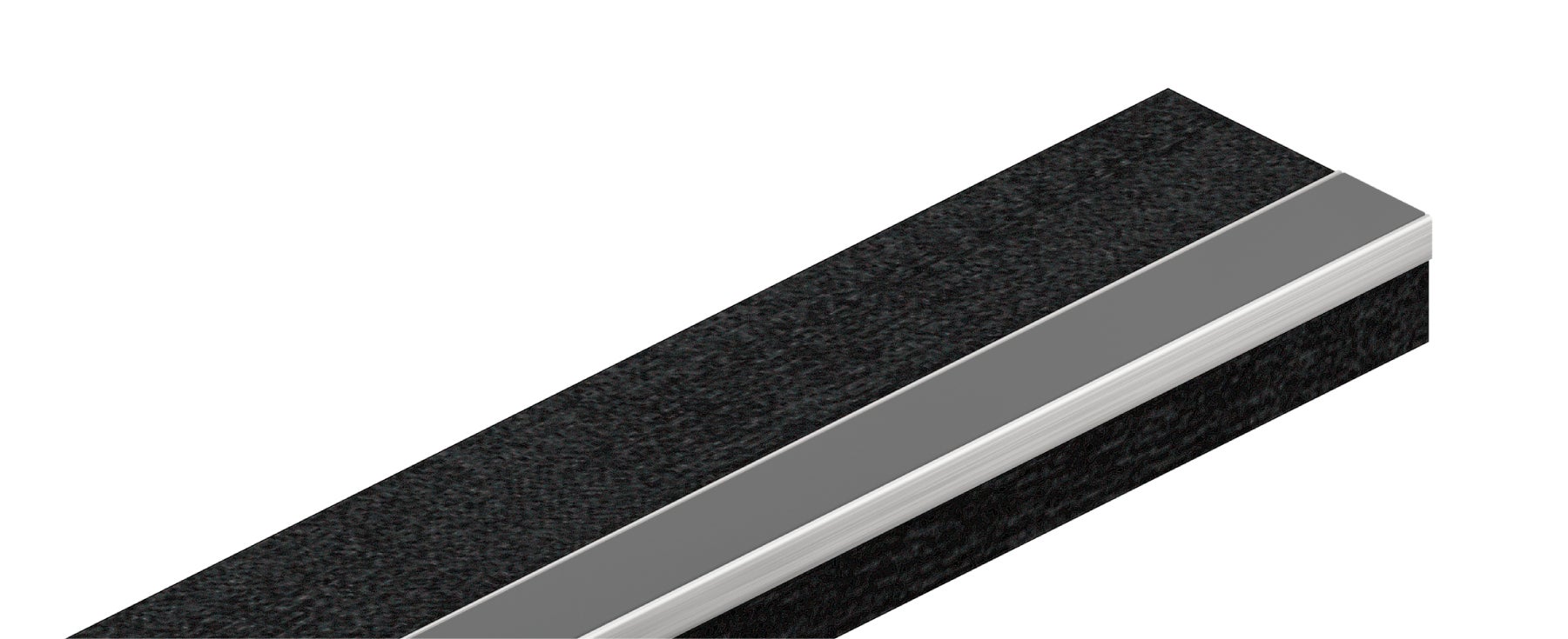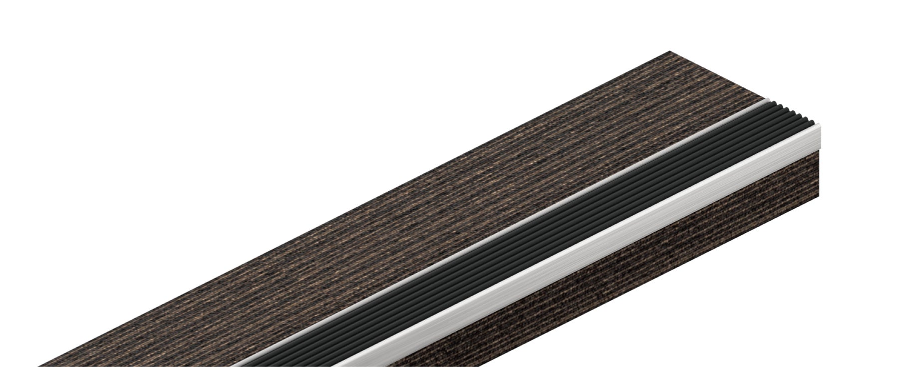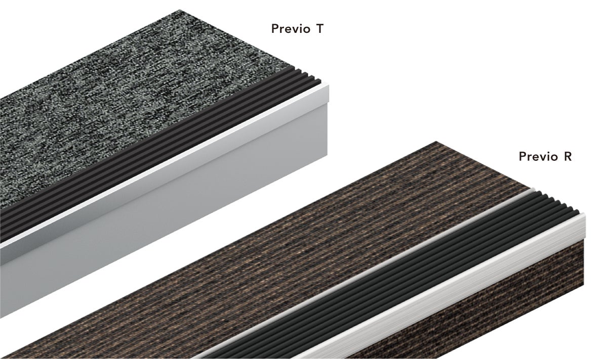 『Previo R』では、ノンスリップと段鼻保護見切りの断面形状を統一。1mmのステンレスプレートを介して併設することによって、座席ゾーンの段鼻保護見切りと階段のノンスリップが一直線に連続するデザインとした。