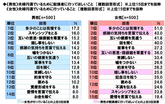 - 夫婦円満でいるために配偶者に行ってほしいこと 男性回答1位「多少のことは我慢する」2位「スキンシップをとる」3位「互いの意思・価値観を尊重する」 女性回答1位「感謝の気持ちを言葉で伝える」2位「話を聞く」3位「家事をする」