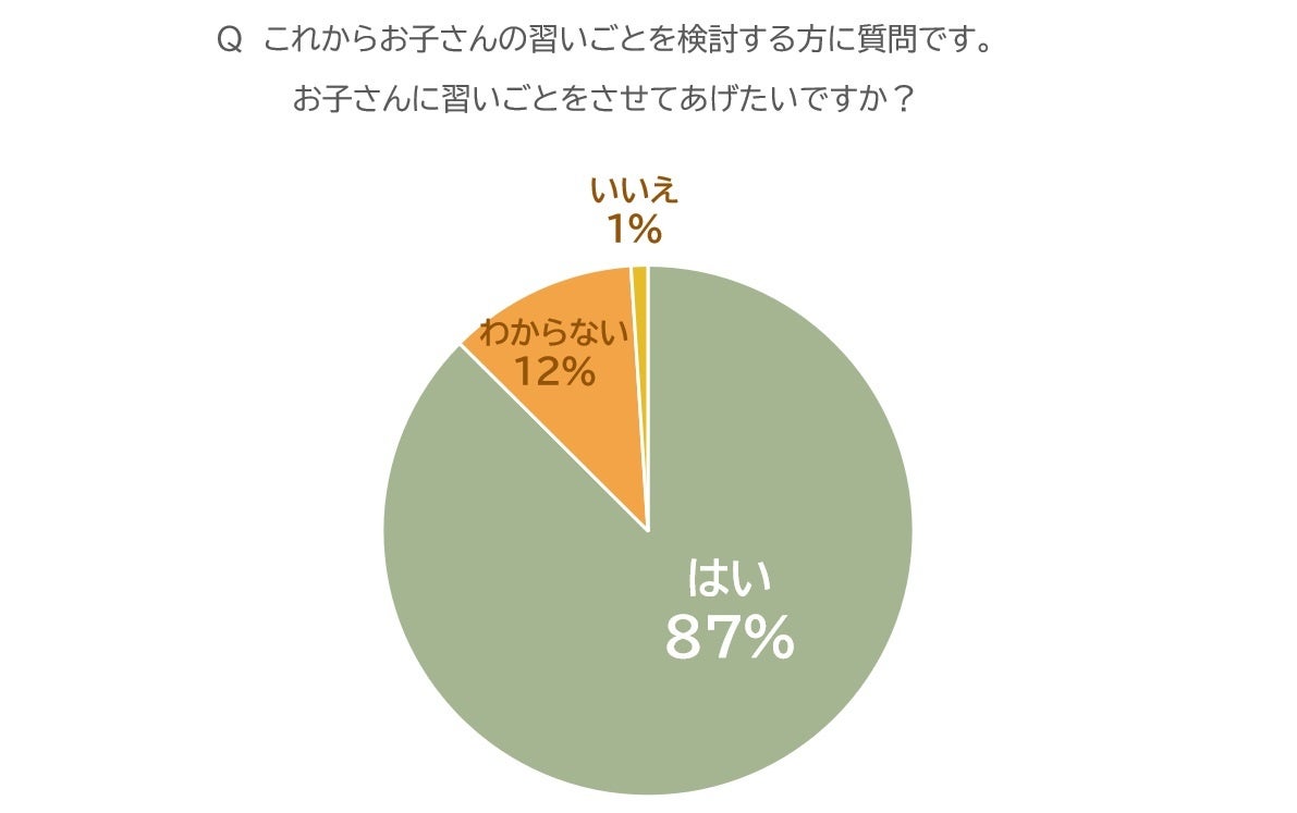 現在、子どもが習いごとをしているユーザーは全体の24%となり、まだ習いごとをしていないユーザーのうち、「お子さんに習いごとをさせてあげたい」と考えているママは87%でした。