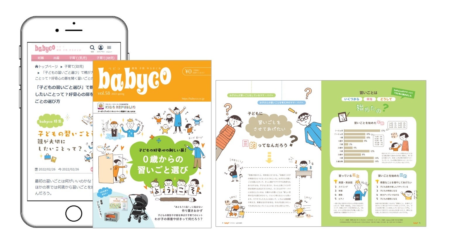 babycoでは、自社でアンケート調査を行いママとパパの意見を集めたり、育児の日常からリアルな声を伺ったりしながら、子育てママ・パパが本当に役立つ情報を、WEBメディアとフリーマガジンを通じて発信しています。