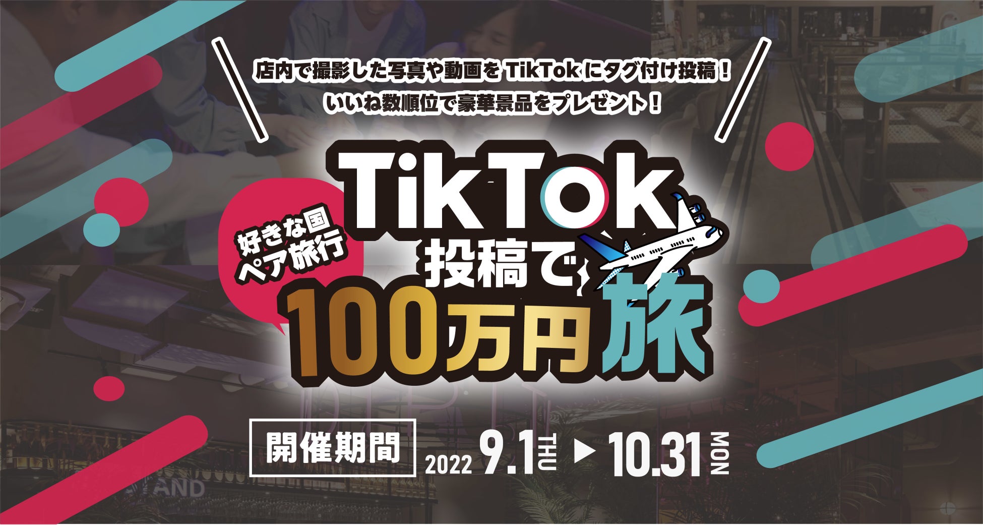 株式会社クラウドエヌ(所在地:東京都渋谷区、代表取締役社長:西山喜洋 )が展開する『オリエンタルラウンジ』『ag』全店舗にてTikTokを用いたイベントを9月1日〜10月31日で開催。最もいいねがついた動画の投稿者には「お好きなところへ行ける100万円分のペア旅行」を贈答するなど、豪華景品をラインナップ。全てのお客様に景品GETのチャンスがあるので、是非奮ってご参加ください。