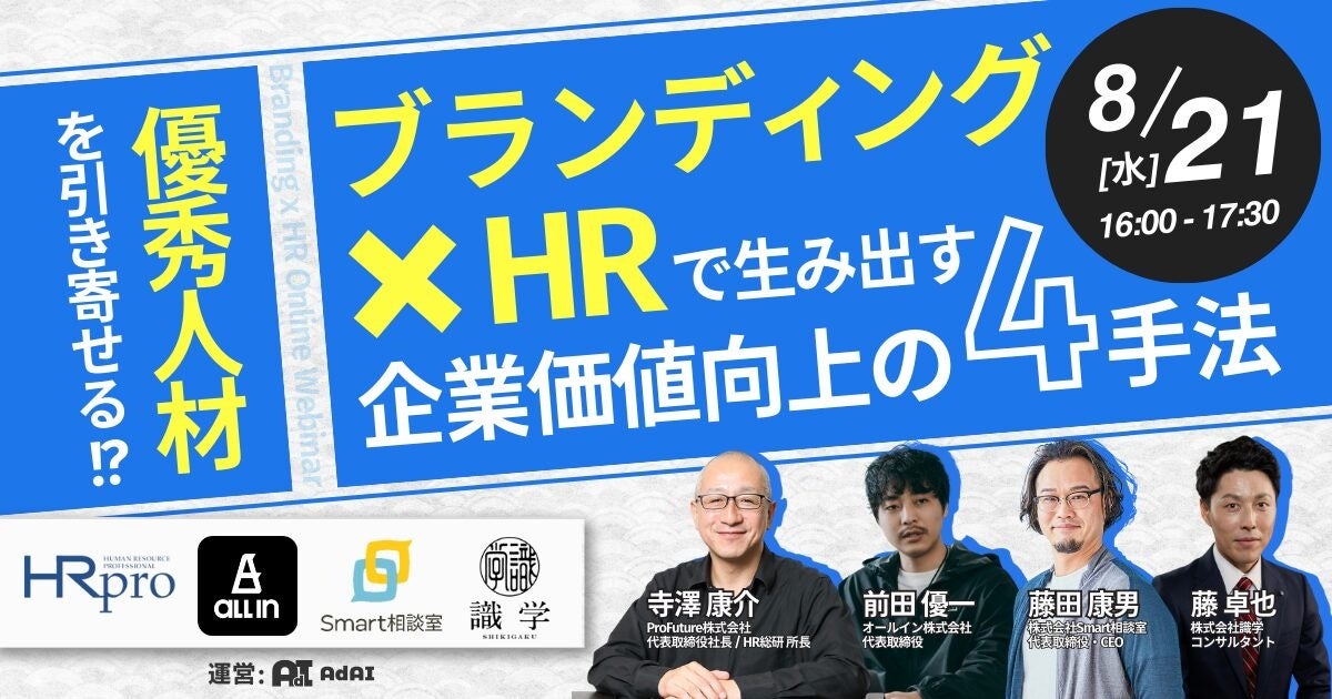 【HRPro/オールイン/Smart相談室/識学 合同ウェビナー】ブランディング×HRで優秀人材を引き寄せる手法とは?【8月21日16時開催】