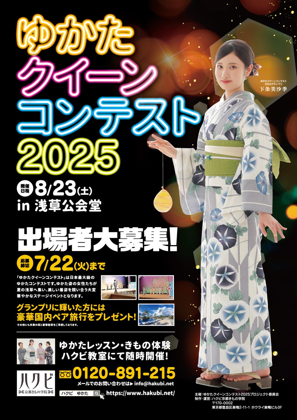 ゆかたクイーンコンテスト2025プロジェクト委員会は、ハクビ京都きもの学院(株式会社ハクビ 本社:東京都豊島区)の運営のもと、日本最大級のゆかたの祭典「ゆかたクイーンコンテスト2025」を夏本番となる8月23日(土)台東区立浅草公会堂にて開催し、女性らしさと和の美しさを兼ね備えた「ゆかた美人日本一」を決定いたします。