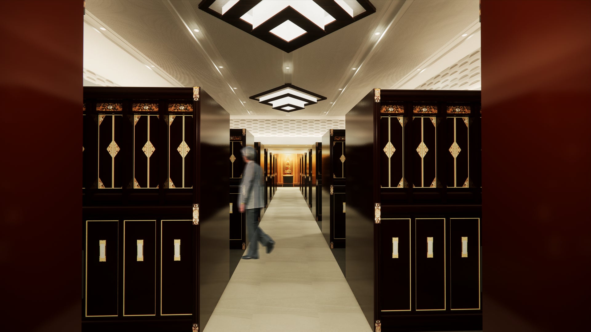 完全屋内型の納骨堂「鶴林」は、冷暖房完備で季節や天候を問わず、安心してゆっくりお参りしていただけます。モダンかつ上質な空間で故人を偲ぶ和やかなお時間をお過ごしください。