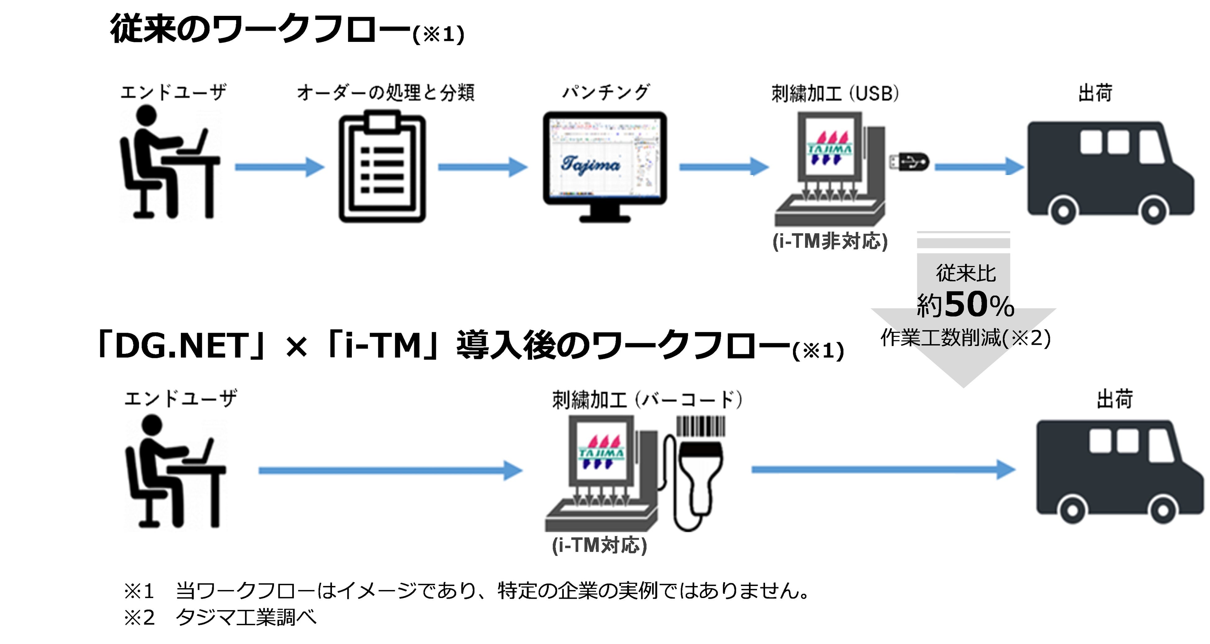 お客様から注文を受けて刺繍加工を行う場合、従来はオンラインストアの注文データを確認しながら担当者が刺繍データ(パンチングデータ)を作成し、データを工場に送付することで商品へ刺繍を行う流れが一般的でした。一方、「DG.NET」のシステムを使用すると、オンラインストアにてお客様が注文を入力する間に刺繍データを作成し、注文完了と同時に刺繍データを工場に送ることができます。工場は受け取ったデータをもとに刺繍を行い出荷することで従来の作業工程をいくつか省略することができます。