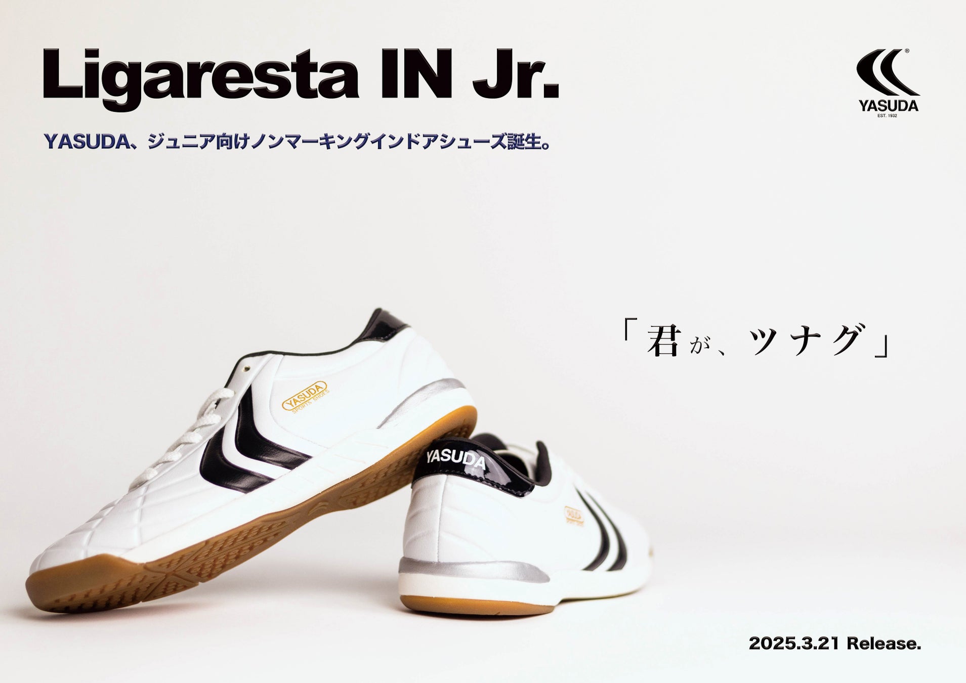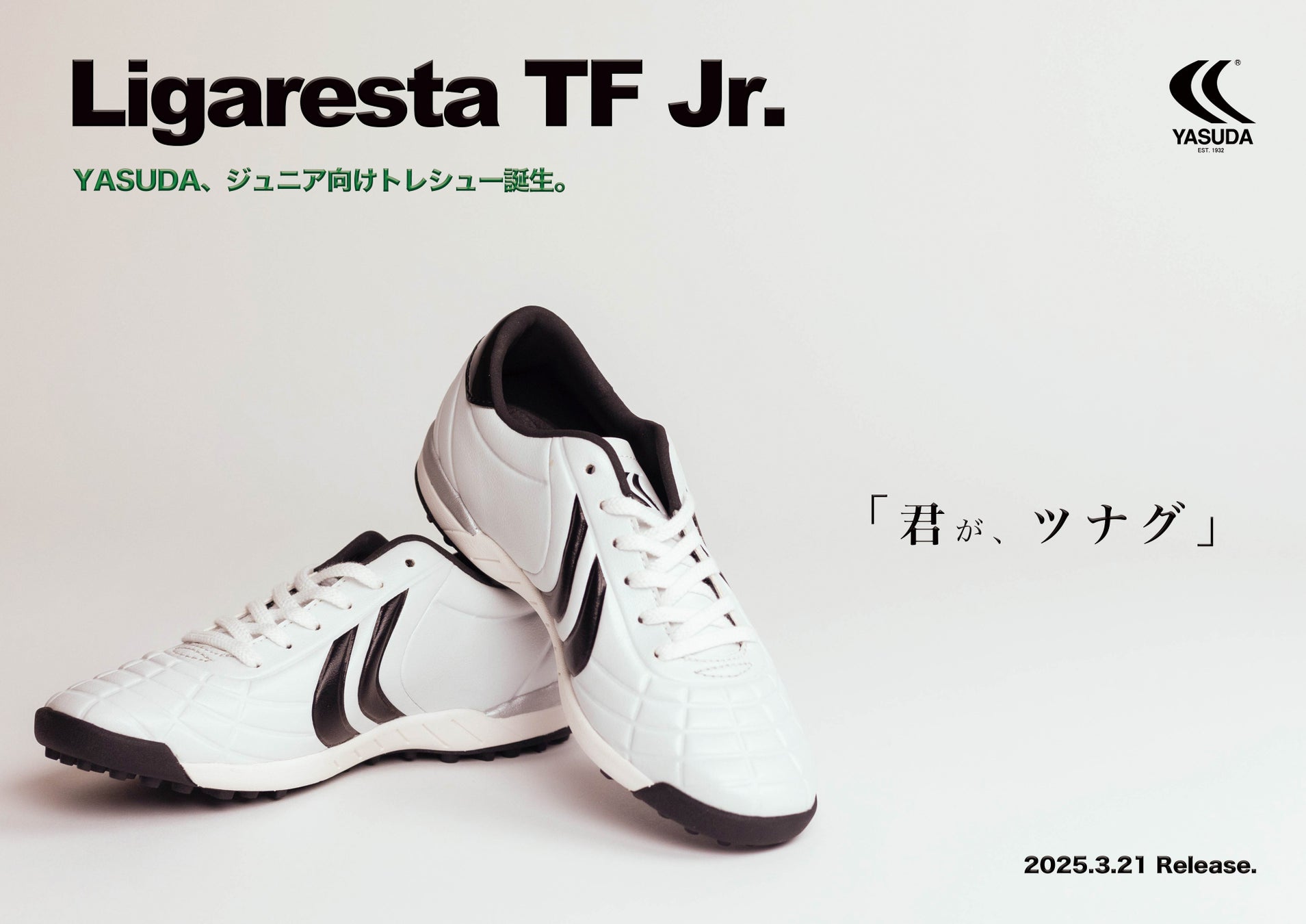 「君が、つなぐ」をキャッチフレーズに掲げ、これまでのYASUDAを支えてくださったシニア世代から、未来を担う若年層へと、YASUDAの想いと、日本人の足に合う日本規格のシューズを「つなぐ」。そして、日本の会社が作る、日本のサッカー選手のためのシューズを、次世代を担う君たちにも履き継いでほしい。そんな願いを込めて開発しました。19cmから展開しており、次世代のサッカープレイヤーたちの足元をサポートします。