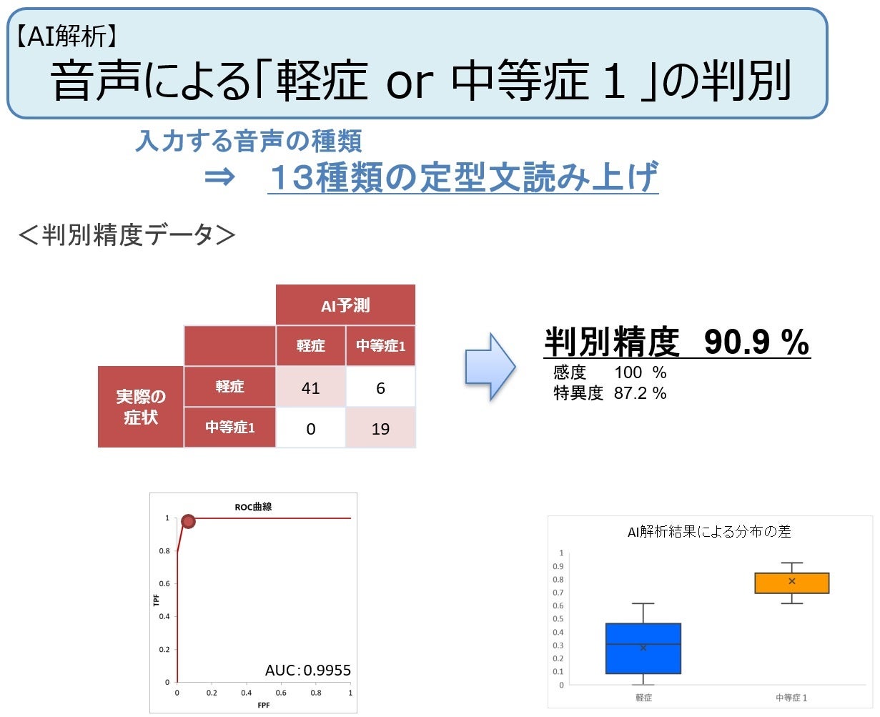 今回の研究結果を活用した技術を実装した場合、特に13種類の定型文を読み上げる方法においては、90%以上という高い精度で、軽症と中等症Ⅰをスマートフォンのアプリ等で判別できることが期待されます。
