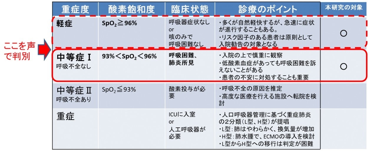 しかし、この重症度分類においても重要な指標となる酸素飽和度(SpO2)を計測するパルスオキシメーターを全ての療養者の方々が持てるようにすることは非常に難しく、そのためそれを補う簡便かつ高精度な技術が必要であると考えられたことから、2021年6月より、音声病態分析技術の活用を目指し、本研究を実施してまいりました。