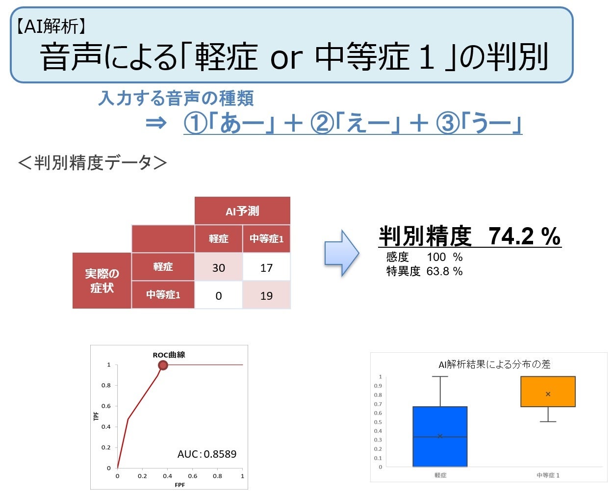 本研究の中間結果として、本感染症の罹患者における軽症及び中等症Ⅰの、音声による判別が可能であることが分かりました。