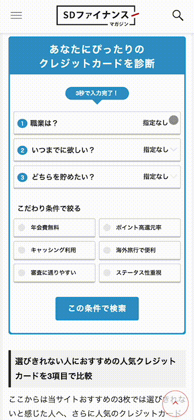 当メディア内には、クレジットカード選びに迷った方へ簡単に診断できる機能も実装。