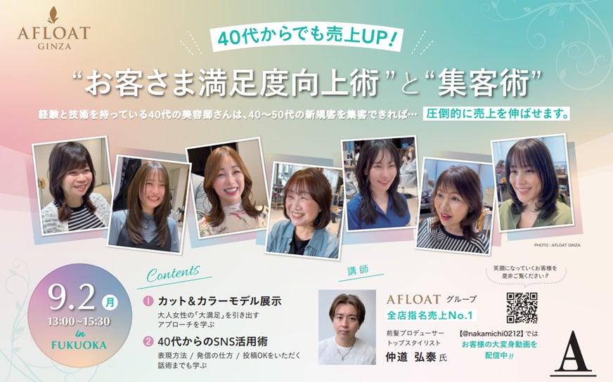 ベテラン・技術を磨いた美容師さんの技術は、今の若手が勝てない部分です。ですが、若手の方は流行をキャッチする力があり、SNSの運用は長けております。これまでの経験を活かしながら、若いスタッフと共に学び、時流にあわせた集客方法を身につけることができれば、ミドル世代こそバリバリ活躍できると考えております。今回セミナーに登壇する仲道は42歳にして初めてAFLOATの月間売上No.1となりました。彼の諦めない気持ちやテクニックを多くの世代に届けたいと考えております。