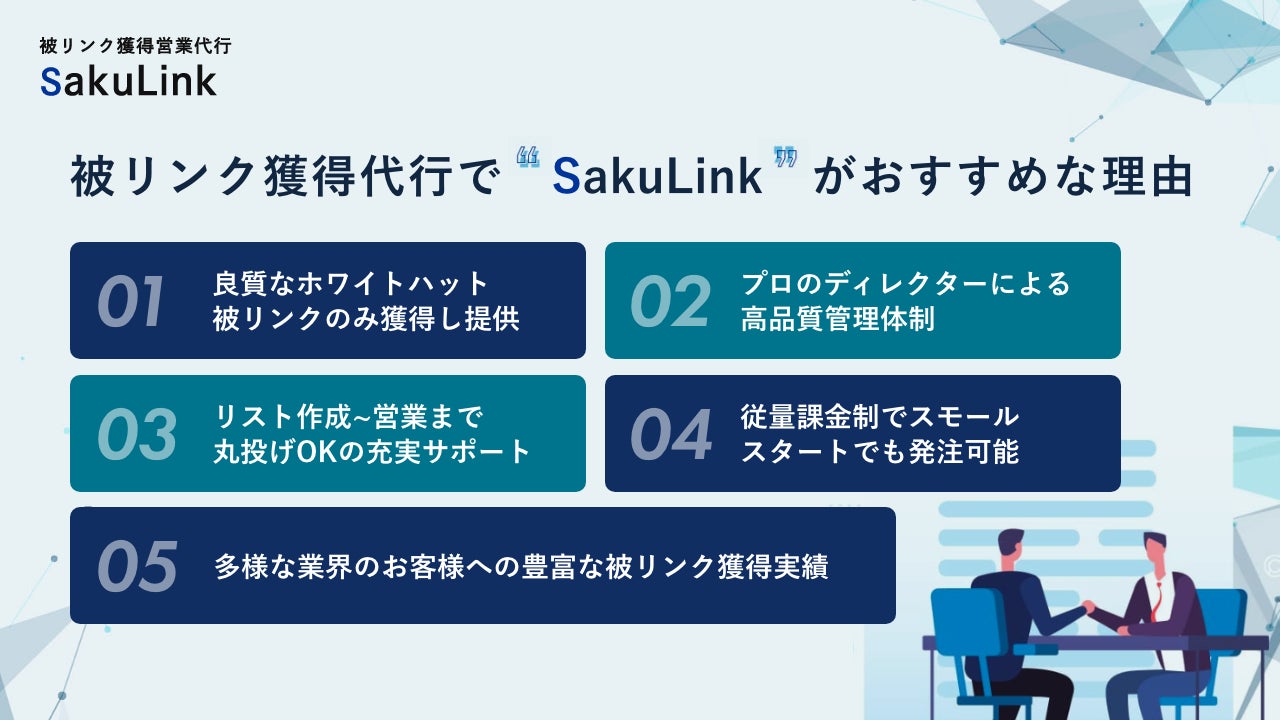 SakuLink(サクリンク)は、Webに精通したプロのコンサルティングチームが、貴社の被リンク獲得をまるっと代行したします。