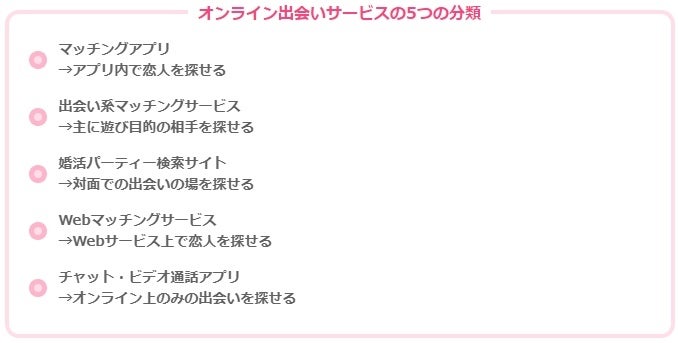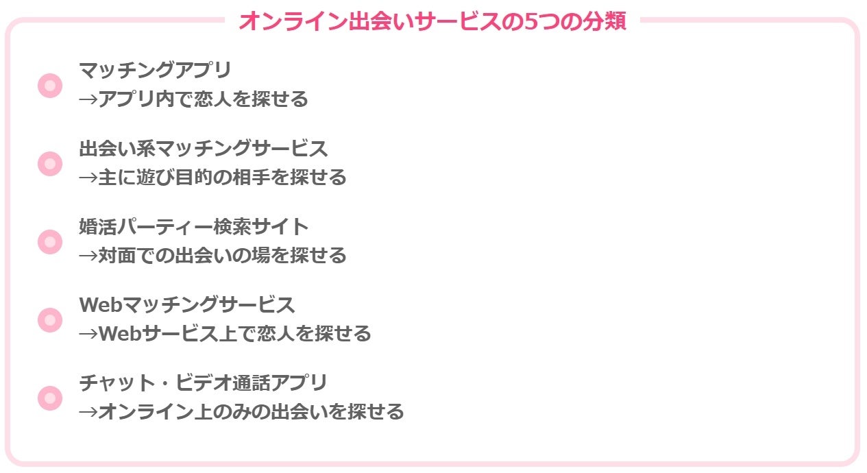 マッチングアプリを始めとするオンラインの出会いサービスは大きく分けて5つに分類されます。下記では5つの分類ごとに詳しく解説しているので、是非参考にしてください。