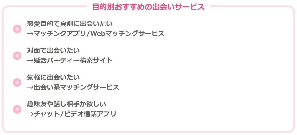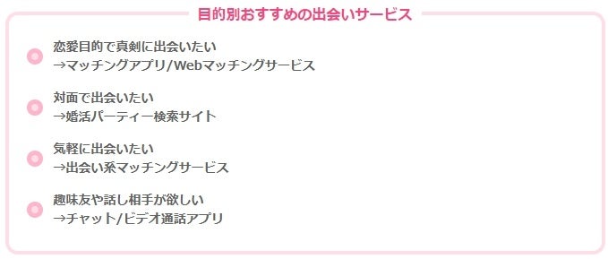 オンラインの出会いサービスは、目的に合わせて選ぶのがおすすめです。サービスにはそれぞれ利用目的があり、同じ目的のユーザーが集まりやすい傾向にあるので、理想の相手と出会えます。