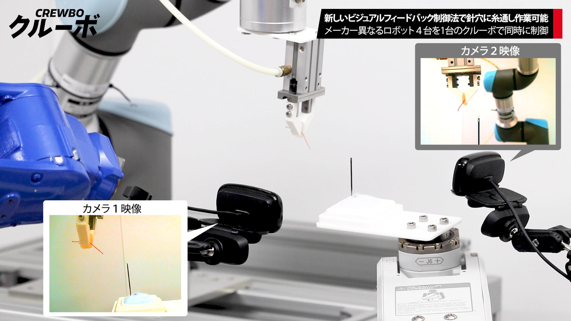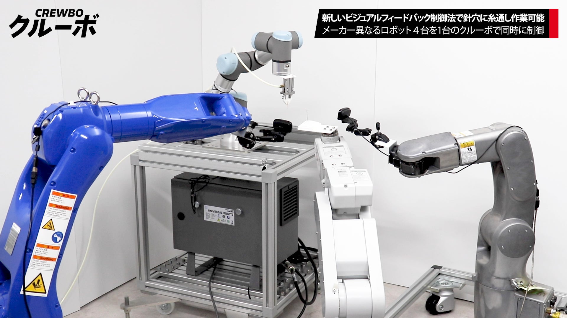 この動画では、ロボット制御ソフトウェア「クルーボ」に接続されたユニバーサルロボット、三菱電機、デンソーウェーブ、安川電機の、4社のメーカーの異なるロボットアームを用いて、協働型ロボットが針の穴に糸を通す様子をご覧いただけます。