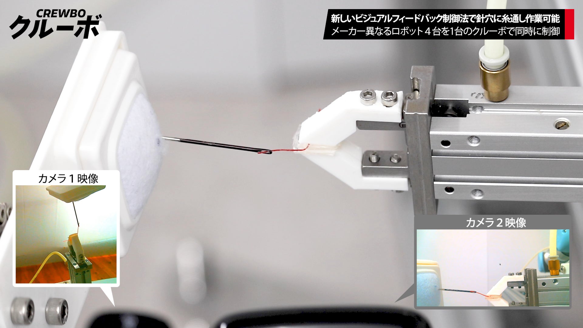 動画後半では、複数台の産業用ロボットアームを協調動作させる多腕制御によって作業環境を変更して再度針の穴に糸を通します。カメラの画角が大きく変わったり、針の位置関係が変わったりしても、前半と同様に高精度な制御によって作業を完遂します。