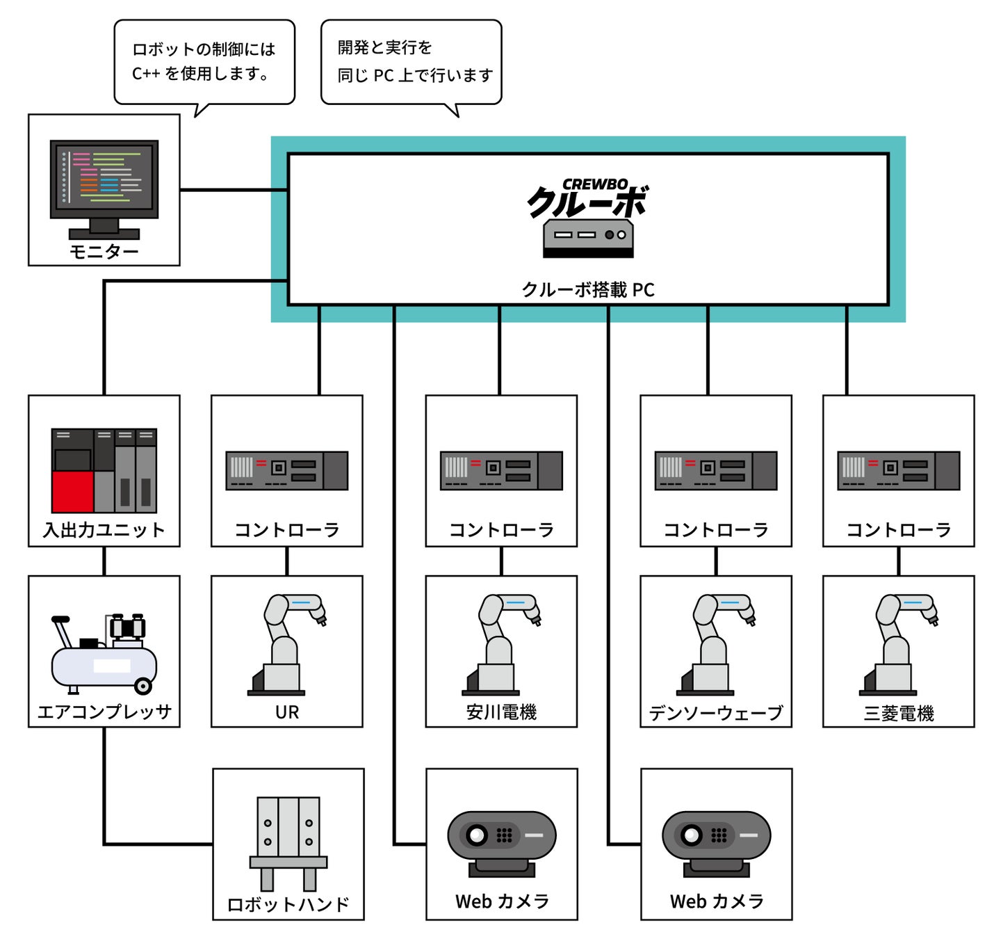 さらに、「クルーボ」を使用したロボットシステムは、複数メーカの異なるロボットアームを同じコンピュータに接続し、同時に制御することができます。これにより、 メーカー混在の協調作業においても、シームレスな多腕制御が可能 となりました。
