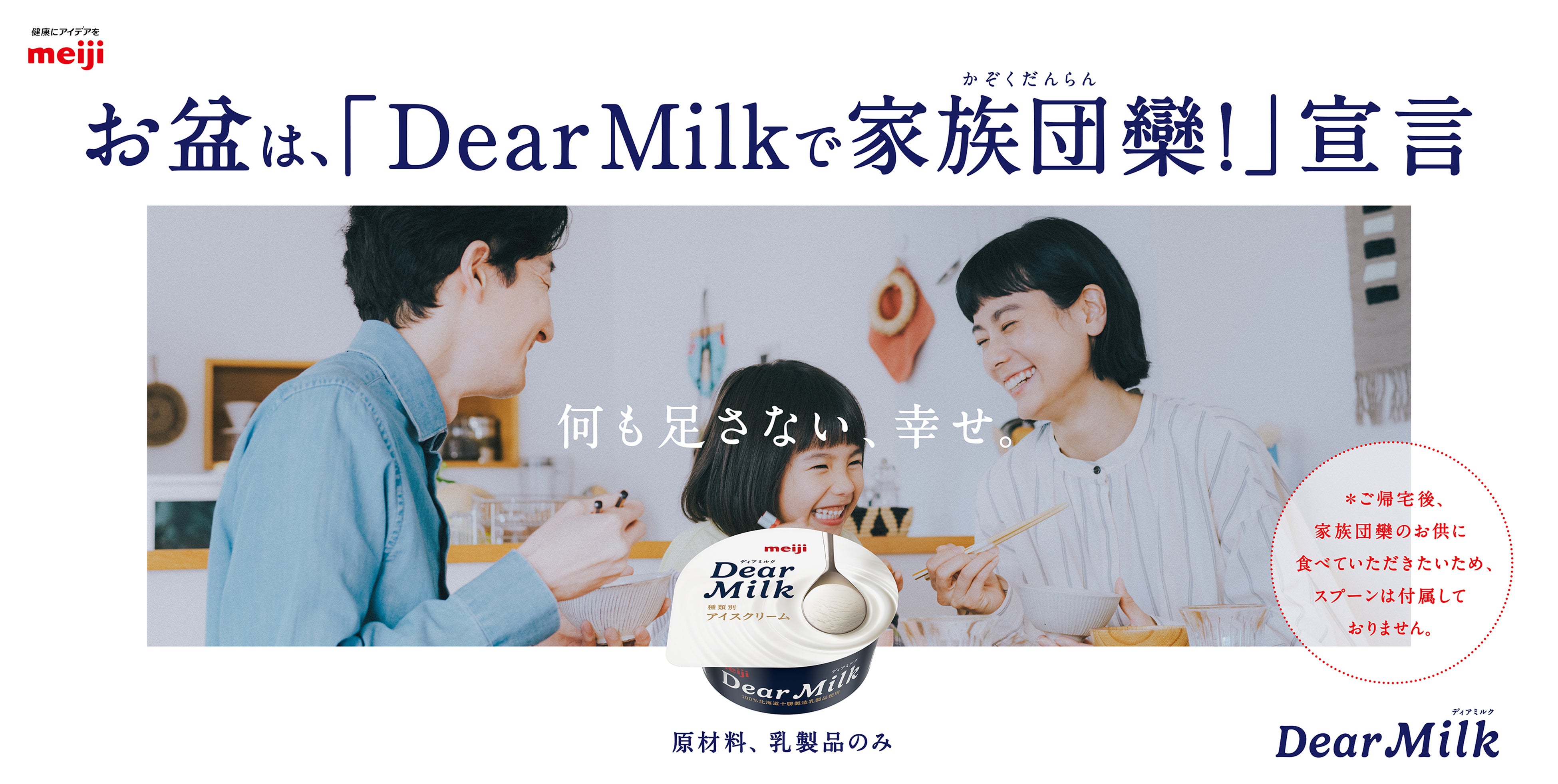 是非多くの家族が集まるお盆休みの団欒の時間を、「明治Dear Milk」とともにお楽しみください。イベントをきっかけに、家族水入らずの時間の良さと、「明治 Dear Milk」だからこその何も足さない「原材料、乳製品のみ」のおいしさが伝わることを願っています。