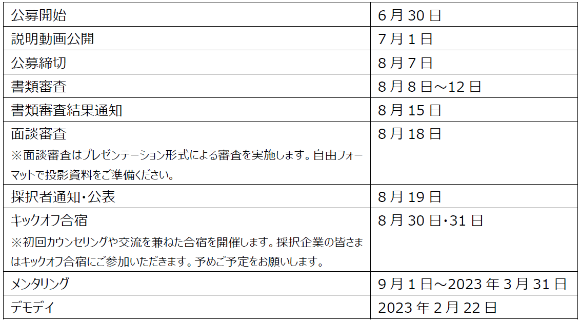 採択企業の事業課題や要望に応じた支援チームによる事業支援、事業提携及び資金調達支援、外部専門家等とのマッチング機会の提供、メディア連携による広報・PR、メンタルサポートに加えて100万円程度の資金までをすべてプログラムで用意します。