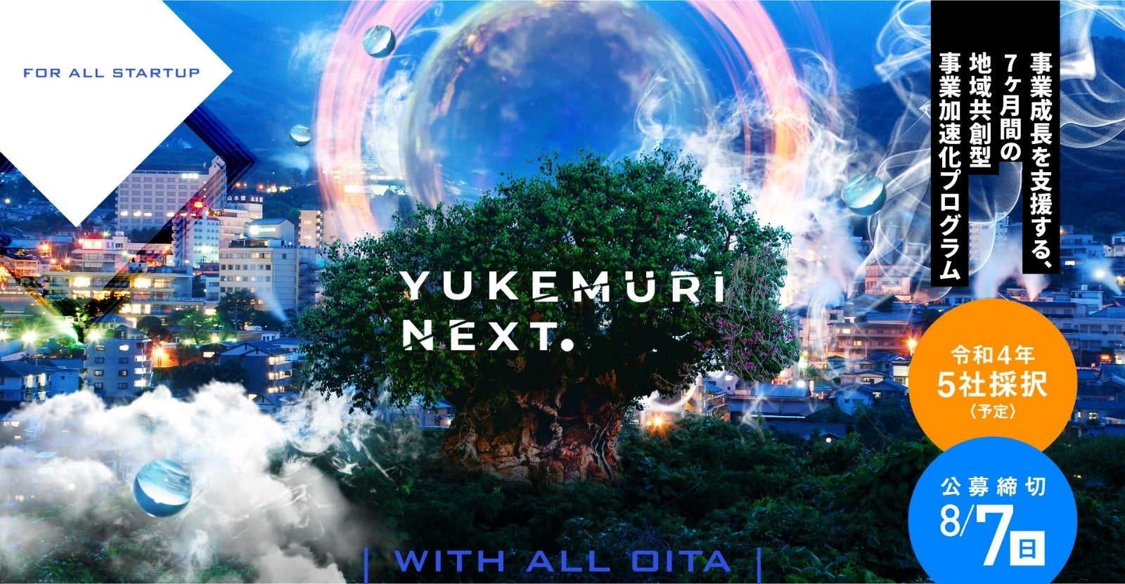 大分県と公益財団法人大分県産業創造機構(おおいたスタートアップセンター)では、成長志向の高い大分県内の起業家、第二創業となる新規事業の成長を目指す中小企業の経営者又は後継となる将来の経営者候補に対して、事業成長を徹底的に支援する地域共創型事業加速化プログラム「YUKEMURI NEXT.(湯けむりネクスト)」を実施します。