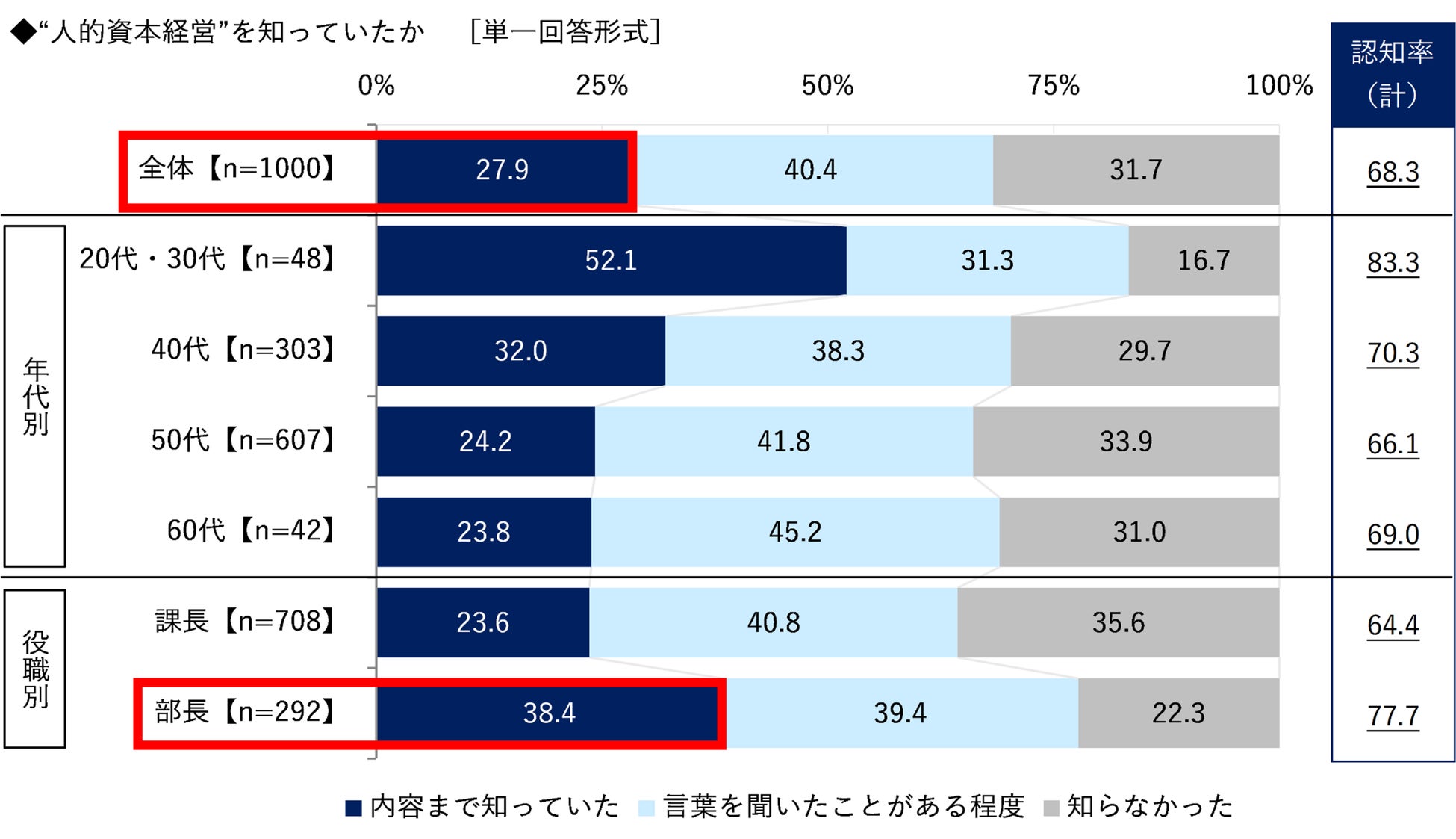 ①人的資本経営の意味まで理解しているミドルマネジメントはわずか28%、部長でも38%と少数派