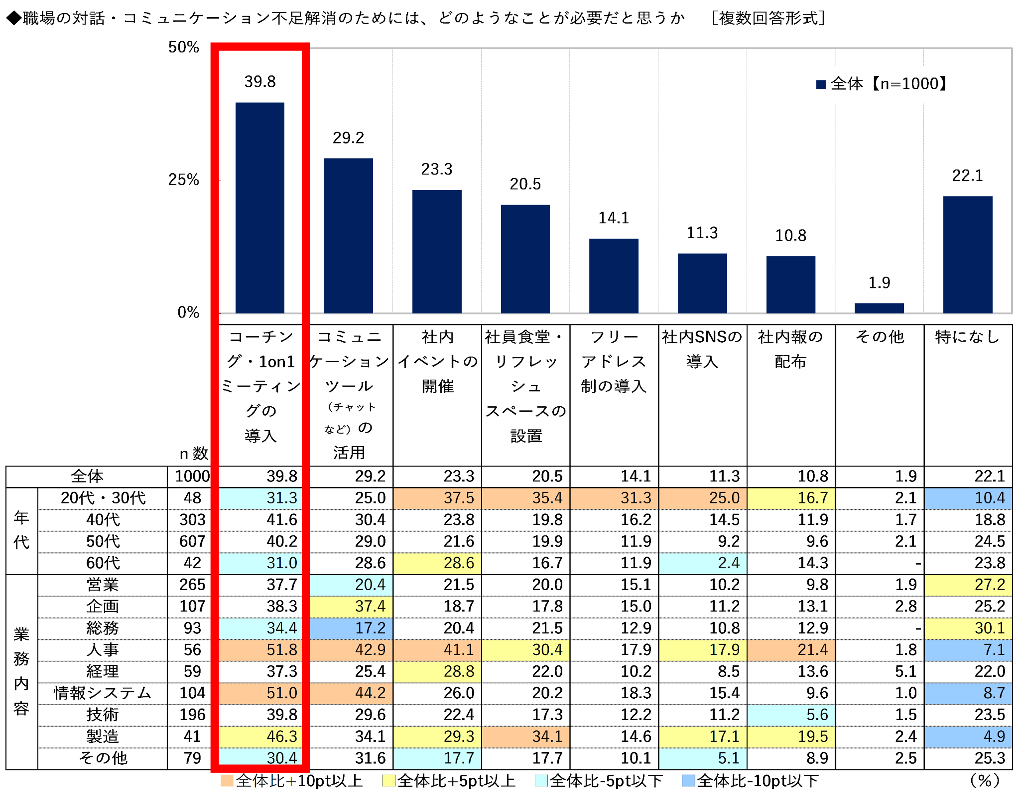 人事部門や情報システム部門では半数超が「コーチング・1on1ミーティングの導入」が必要だと回答