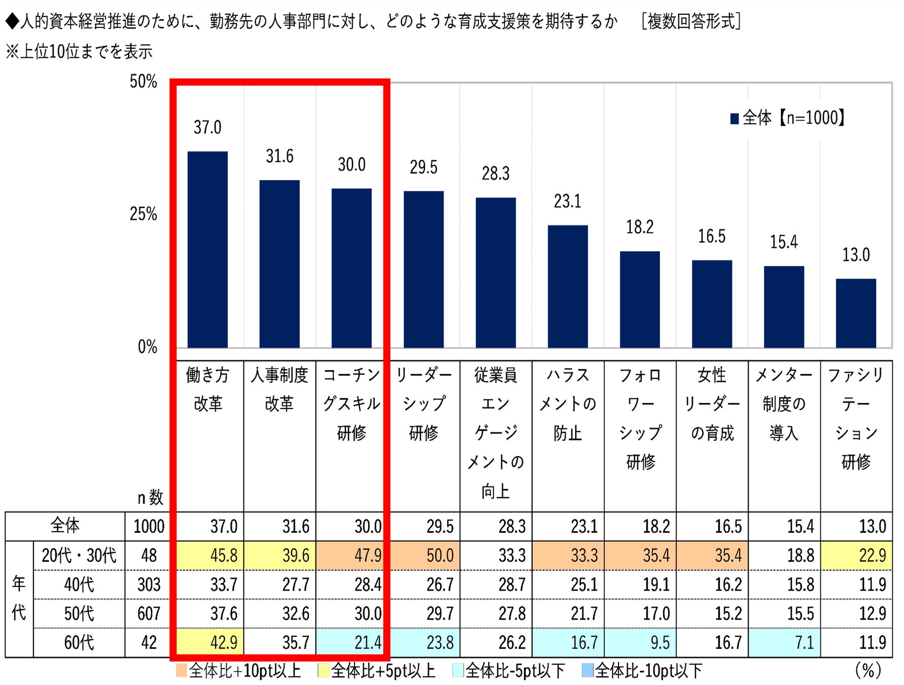 ・制度周りのハード面(働き方改革・人事制度)だけでなく、ソフト面(コーチングスキル研修)に対する関心の高さもうかがえる