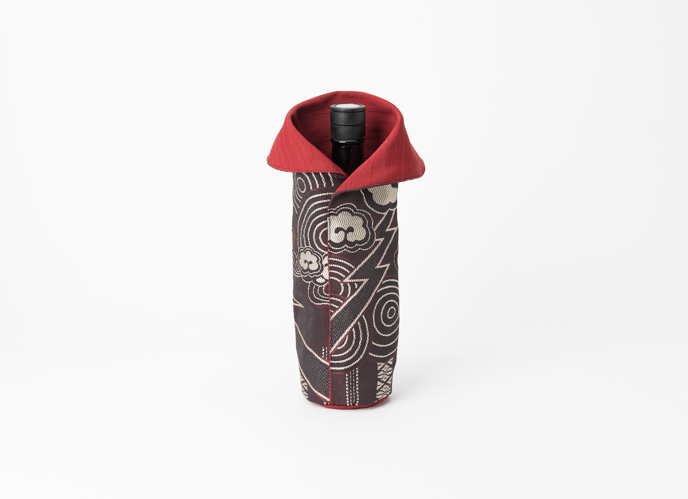 菅丞相が雷神と化したことを視覚的・象徴的に示すよう、歌舞伎の衣裳に表現された雲と雷の図案を参考にしながら、鎌倉時代から受け継がれる博多織献上柄のデザインと掛け合わせ再構築したオリジナル献上柄です。本事業では、上記で開発した博多織のオリジナル献上柄を使用したボトルカバーを制作しています。