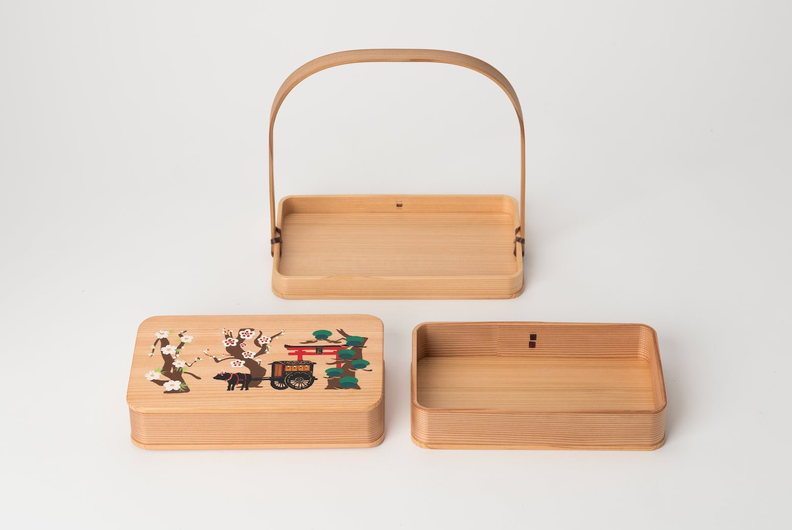 『菅原伝授手習鑑』の梅王丸、松王丸、桜丸の三つ子が神社の前で対峙する「車引」の場のイメージをベースに、福岡県の県花でもある「梅」に加えて「松」「桜」を博多曲物の絵付風にアレンジし、2段重の蓋に絵付けを行ったオリジナルの博多曲物2段重かご付です。直線の多い形は凛とした雰囲気をまとい、晴れの席 に打ってつけです。お料理以外でも、和菓子の菓子器などにご使用頂きたい器です。