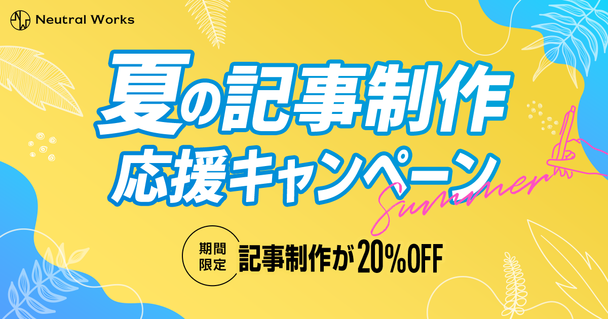 SEOに強みを持つニュートラルワークスが提供する「記事作成代行サービス」を、通常1記事50,000円(税別)のところ、期間限定で20%OFFの40,000円(税別)にてご利用いただけます。先着5組様までとなりますので、お早めにご応募ください。