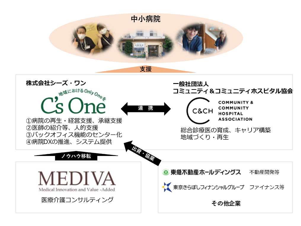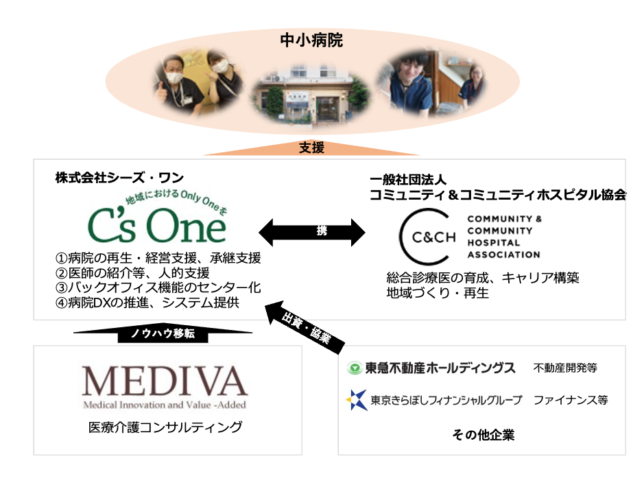 また、出資者である東急不動産HD、きらぼしグループ、その他企業とは事業パートナーとして、それぞれの強みを活かし、病院の経営改善と地域づくりに当たります。