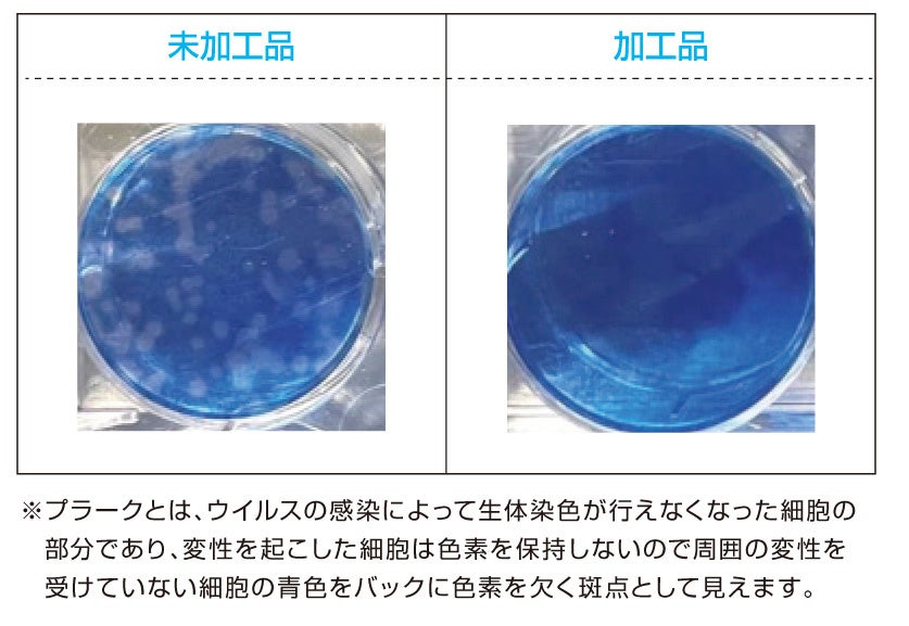 未加工品と抗ウイルス加工品にそれぞれ特定のウイルスを接種し、25℃で2時間後に特定ウイルスの数を測定した結果99.99%以上減少していたことが確認されました。