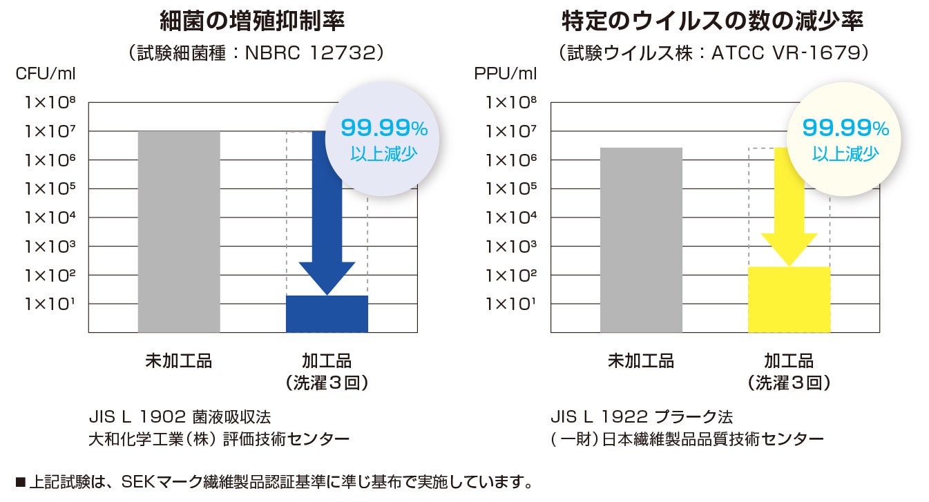 | 繊維上の細菌の増殖を抑制し、防臭効果を示す加工を施しています。 | 繊維上の細菌の増殖を抑制する加工を施しています。 | 繊維上の特定のウイルスの数を減少させる加工を施しています。 |