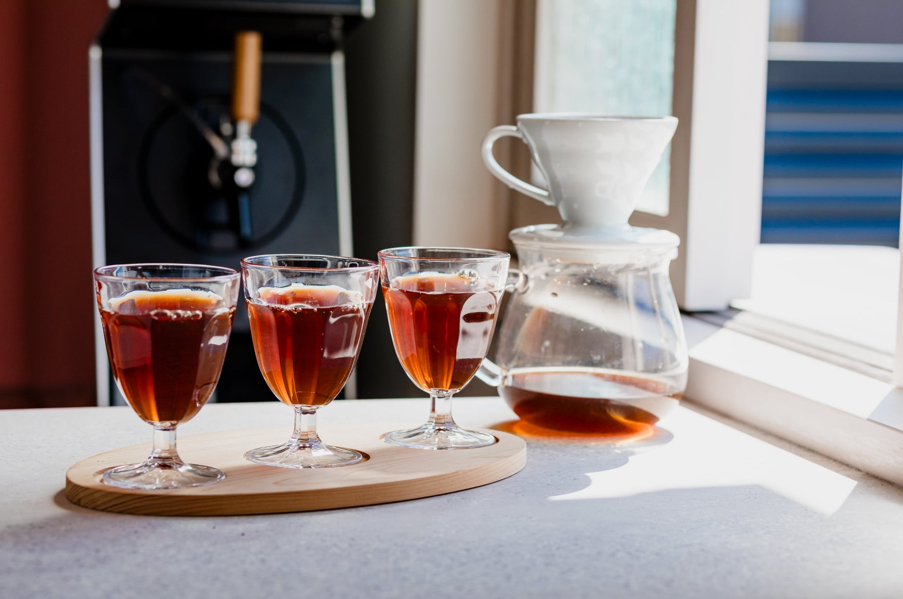 alt.が浅煎りコーヒーにこだわる理由は、産地によって特徴が異なる豆の個性・フレーバーを最大限引き出し、本来はフルーツであるコーヒーを、一番おいしく感じられるためです。そのため、砂糖をいれなくても甘さを感じられるように基本的にブラックで提供し、そして豊かな香味の経時変化を楽しめるように、ワイングラスで提供します。