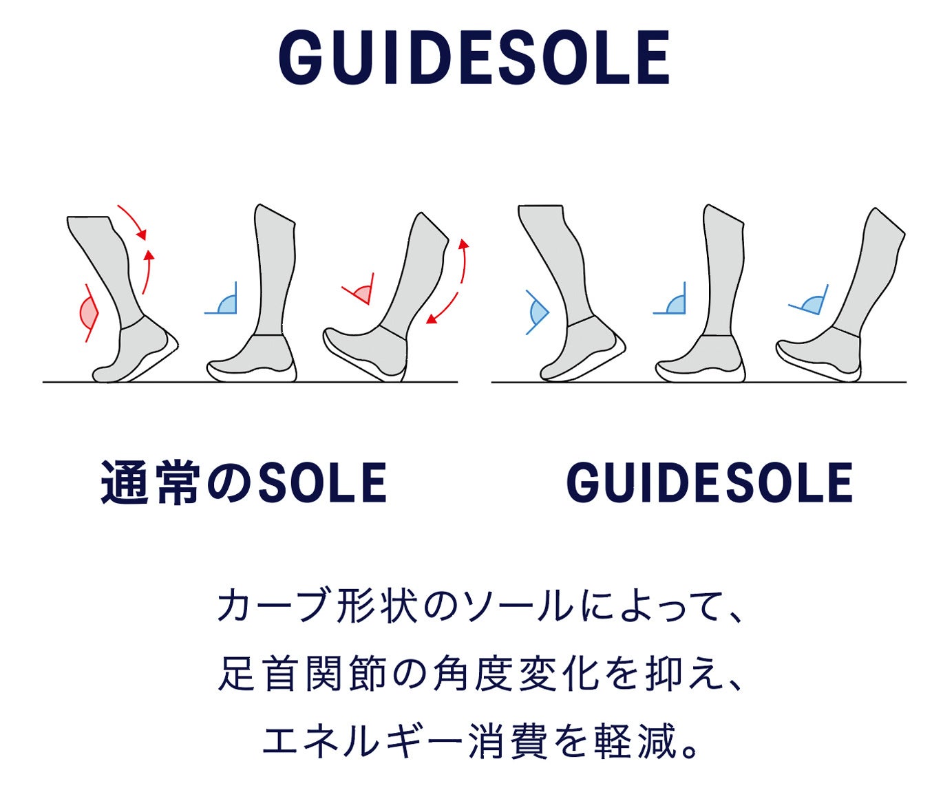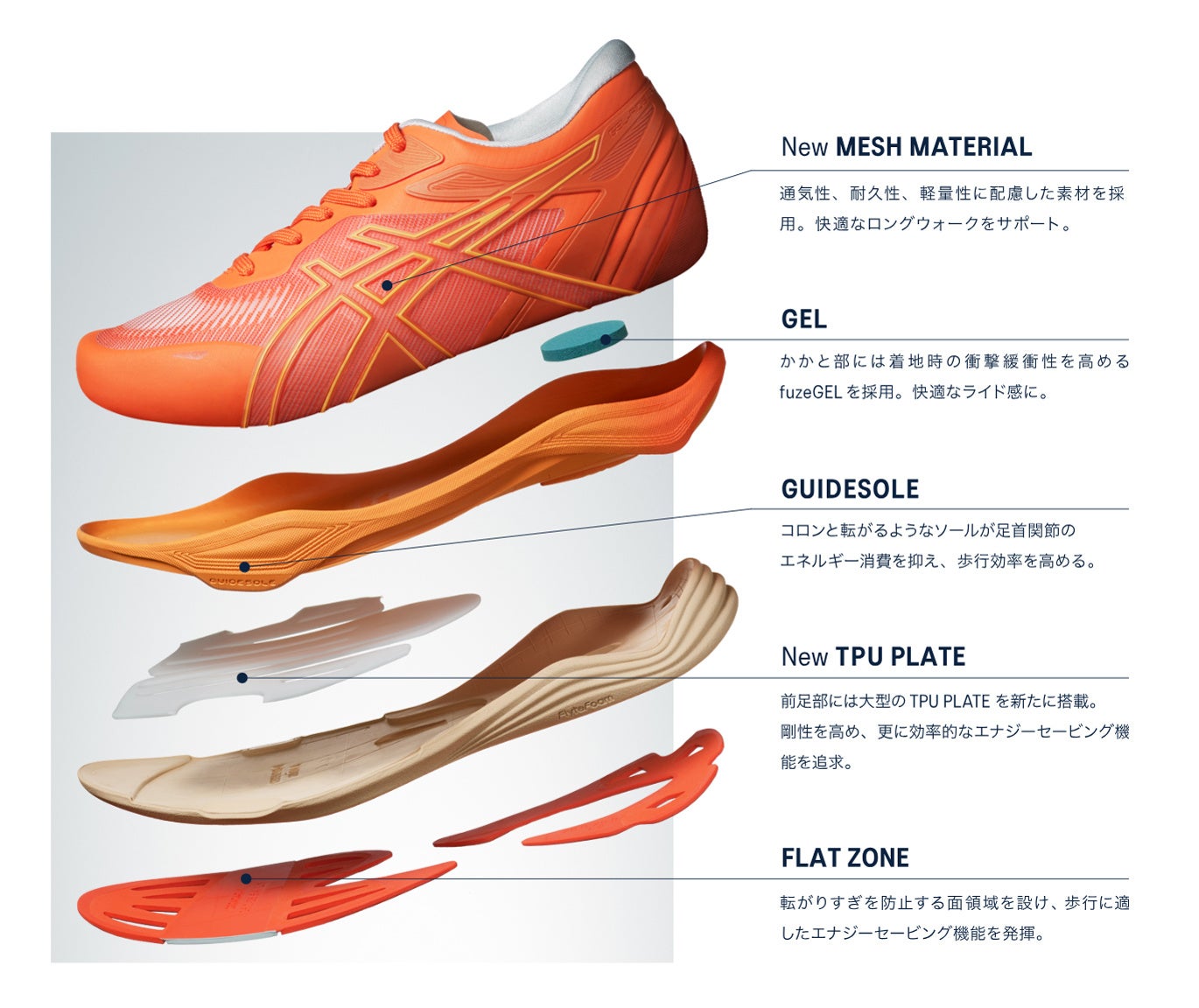 靴底は、ランニングシューズから着想を得た「ガイドソール」構造を採用しています。靴底前部にカーブを設けることで歩行時の足首の屈曲を減らし、足首関節のエネルギー消費を抑えて歩行効率を高めています。踏み付け部には、剛性に優れた大型の樹脂製補強材「TPU PLATE(ティーピーユープレート)」を新たに搭載し、前モデルよりも“コロン感”を高めています。シューズ内には、アシックススポーツ工学研究所での研究をもとにした、足の裏側から甲に向かって土踏まずを引き上げるようにしたベルト構造を配置しアーチをしっかりとサポートするなど、さらなる歩行時の快適性と安定性を追求しました。