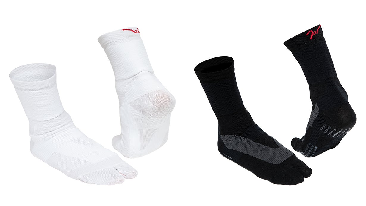 足首を固定するホワイトテーピングではなく、足首(足部)の動きに特化した伸縮性のあるキネシオテーピングを用いた足部の運動サポートを目的とした機能性靴下です。