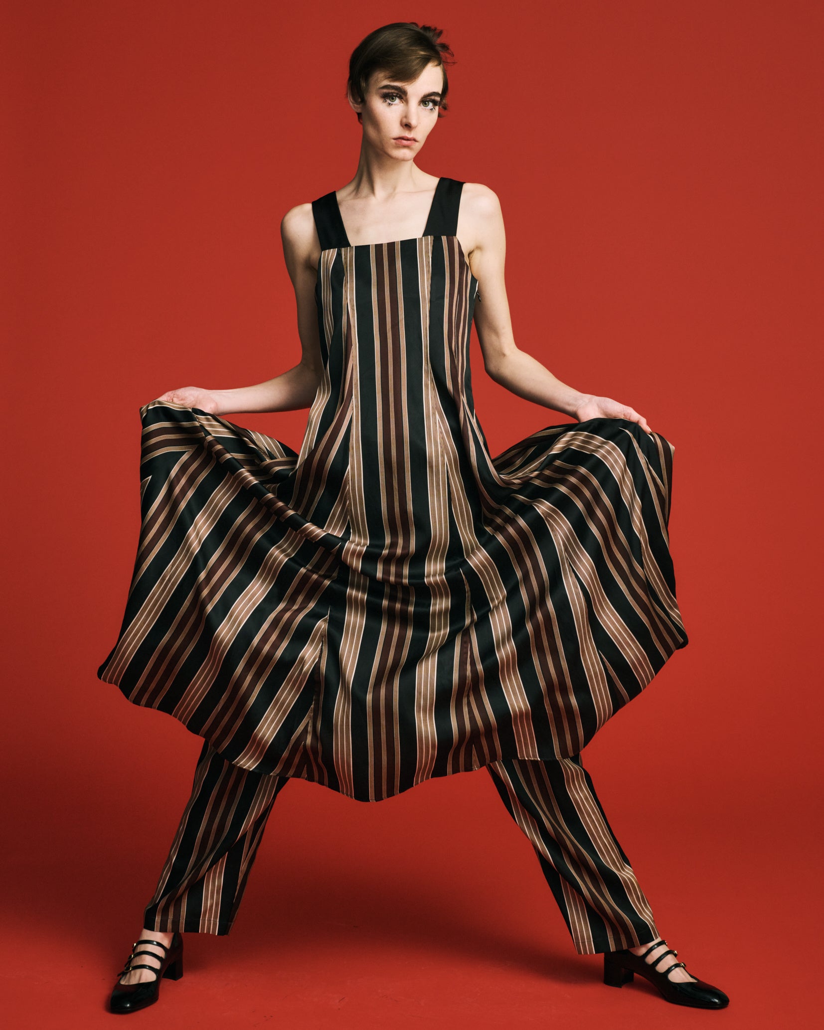 “街に踊る”をテーマに、オリジナルのテキスタイルを使用したマスキュリンなセットアップ、大胆なカッティングがドラマティックなコート、構築的なデザインが美しいドレス、メンズサイズのシャツをモデリストのテクニックでつくりあげたデザインシャツなど、着る人をより彩るコレクションとなっています。