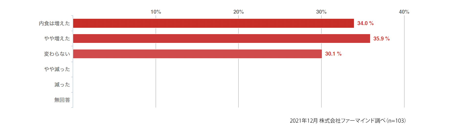 増えた・やや増えたという回答が69.9%と約7割。お家時間が増え家での食事の機会が増えたことが伺えます。