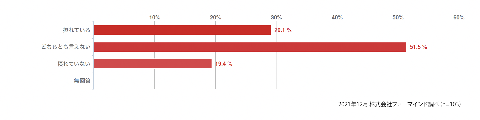 どちらとも言えない・摂れていないという回答が約7割。先の質問で、野菜のメニューが増えたという回答が4割あったものの、野菜が十分摂れているという回答は3割に留まりました。