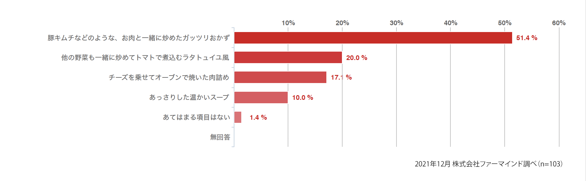 最後に、「炒めておいしいきゅうり」を使ったレシピでどんなメニューが一番食べてみたいか、アンケートをとりました。1位は、豚キムチのようなお肉と炒めたスタミナメニューでした。新しいきゅうりの食べ方レシピも下記にご紹介。是非参考にしてみてください。