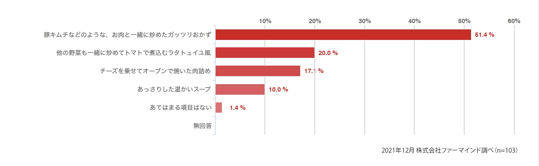 日々の食事で今よりも野菜の摂取を増やしたいものの、レパートリーが十分ではないため野菜料理が増えず、ジレンマを感じている回答が6割ありました。
