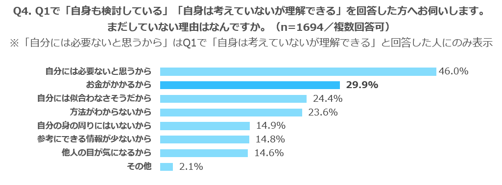一方、美容医療男子を「理解できない」と回答した1割ほどの人にその理由を聞いてみると、半数以上の53.8%が「なんとなく」と回答、メイク男子を「なんとなく」理解できない人よりも割合が多い結果となりました。メイクほどジェンダーイメージとの結びつきもなく、公表する人もそもそも多くない中で、否定するだけの大きな理由がないことがうかがえます。