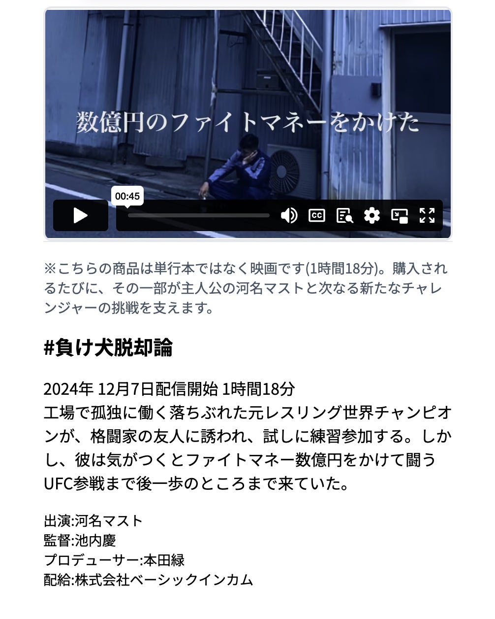 彼は経済的な困難を抱えながらも、自らの人生を変えるために新たな挑戦に乗り出します。 河名は孤独な工場で働く落ちぶれた元レスリング世界チャンピオンであり、過去と向き合いながら新たな道を模索しています。彼は格闘家の友人から「試してみないか?」と誘われ、練習に参加することになります。この一歩が彼の人生を変えるきっかけとなり、気がつくとファイトマネー数億円をかけて闘うUFC参戦まであと一歩のところまで来ていました。
