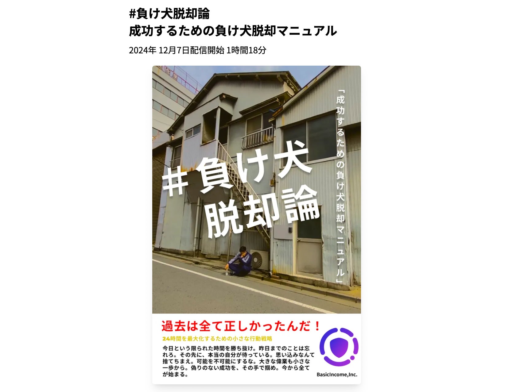 株式会社BasicIncome(本社:京都府福知山市、代表取締役社長 : 池内慶)は、2024年12月7日に配信開始の感動の映画『#負け犬脱却論』の前売りチケットを本日より販売開始します。