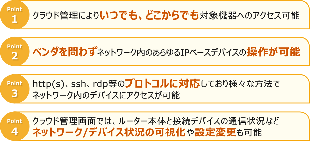 ローカルへのアクセスはブラウザ経由でアクセスとなるため、パソコンからと管理側のデバイスは問わないため、いつでもどこでも簡単にアクセスしたい機器に接続することが出来ます。