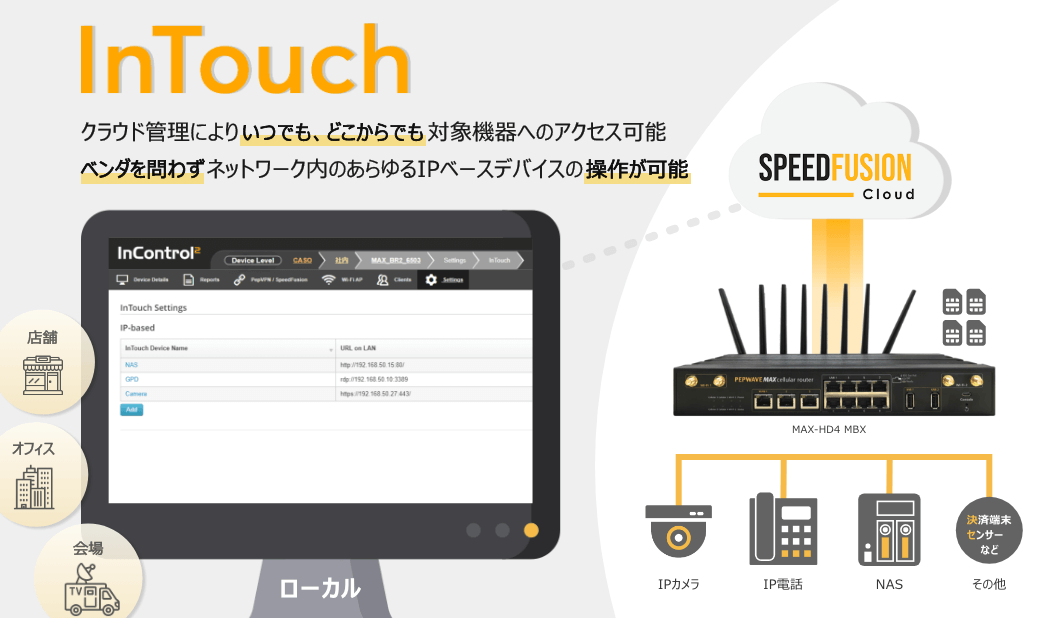 現在、無人化・自動化された店舗や施設の拡大により、生活の中でIoT技術などを活用したデジタルデバイスは急速に普及することが予想されます。従来、遠隔地にある機器は、ローカルネットワーク内からの接続や、煩雑なVPN設定、専用管理ツールの使用等でなければ接続することができませんでしたが、「InTouch」によりPeplinkルーターに接続しているデバイスに対して簡単に遠隔アクセスができる仕組みを提供します。