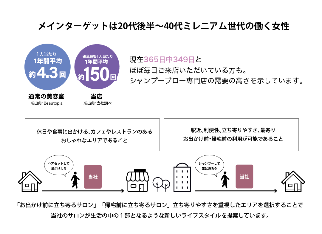 仕事と家庭の両立に毎日忙しい女性たちに向け、ジムやカフェに寄るような気持ちで「お出かけ前や帰宅前に気軽に立ち寄るサロン」として新たなライフスタイルを提案しています。
